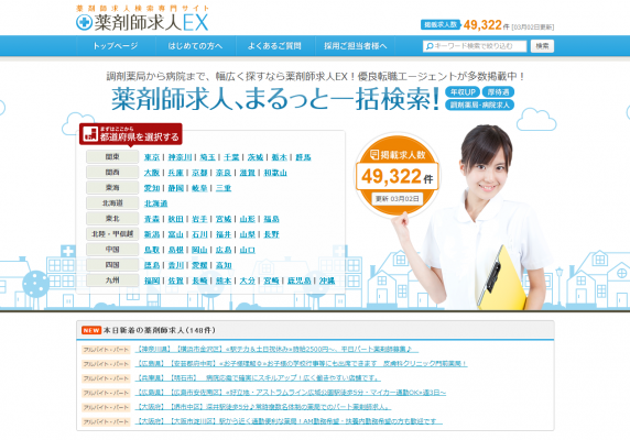 『薬剤師求人EX』は、2013年1月に開始した完全成果報酬型の求人掲載サービスです。薬剤師を募集する全国の薬局や企業が、求人情報をサイト上に掲載することで、求職中の薬剤師から直接応募を受け付けることができます。掲載費用は無料で、薬剤師の採用時点での成果報酬型媒体となっているため、掲載課金型のインターネット求人媒体と比較して、低リスクでの採用を行うことが可能です。また、薬剤師に特化した集客を行っておりますので、薬剤師資格を持ったユーザーに確実性の高いリーチをすることができます。