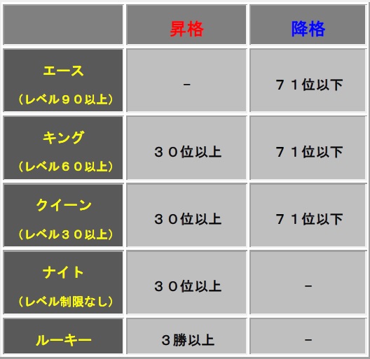 ※エース、キング、クイーンのリーグで戦闘回数が1回もなかった場合、必ず1リーグ降格します。
