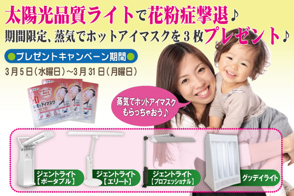 ヒーリングライト研究所では、花粉症の季節到来に合わせて、太陽光品質のライトで免疫力アップをお手伝いする、スペシャルなキャンペーンを実施することをお知らせいたします。
