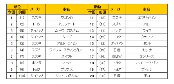先月に比べると動きの少なかった今月ですが、3位~6位には軽自動車が相変わらずの強さを見せています。