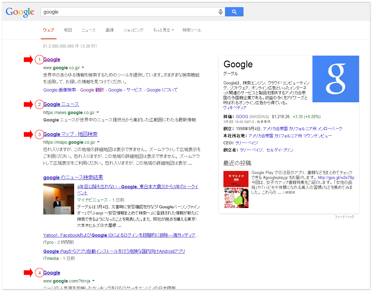 掲載順位は、Google検索結果画面の掲載サイト名そばに「1. 2. 3. ...」といった小さな番号で表示されるのみですので、検索結果の表示内容やレイアウトに大きな影響を与えることはありません。