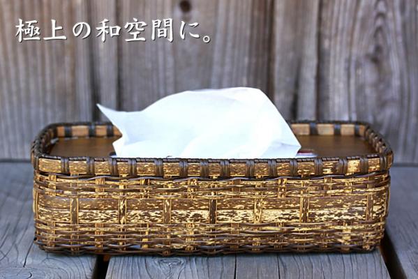 虎竹ティッシュケースに使用している竹ヒゴは、一本の竹ヒゴを二枚に裂いて、編みやすくすることにより、より柔らかな表情の編み込みが生まれます。これも熟練の職人だからこそ出来る技です。底や口の部分に使っている籐巻きは、虎竹に合わせた色合いに染め上げたものを使用。蓋部分も木目を活かしながら塗装を施すなど、全体の色の調和が取られていて、所々に込められた職人の気配りを感じます。ティッシュの容量により、高さの高い物低い物とありますが、虎竹ティッシュケースは、上から蓋を置くタイプですので、少し高めのティッシュボックスでも対応可能。底を開けて使うティッシュケースだと生じる、ティッシュボックスとの間に出来る隙間も解消されます。また、エコの観念から最近目にする機会が増えた、袋入りのティッシュ。容量が少なくなると、袋も一緒にくっついて持ち上がることが多くなりますが、虎竹ティッシュケースに入れて使うと、蓋が重しになり取り出しやすくなります。詰め替え用のティッシュを入れても便利です。