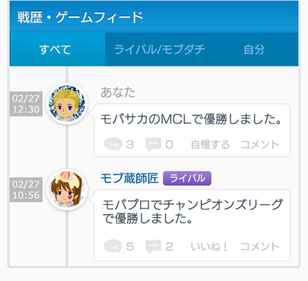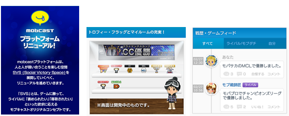 これは一般的なSNSで提供されている達成管理(アチーブメント機能)とは異なり、これまで単にゲームと連携したソーシャルネットワークだった場に、「ライバルと競い合う」「ライバルと褒め合う」というゲーミフィケーションの要素が入り込んだものです。また、ゲーム内でのユーザー表彰や、イベント実施の簡易化にも役立つほか、mobcast上のゲームを横断的に利用する、勝ち負けにこだわるユーザーに向けた、さらなる達成感を満たす総合的な演出機能として期待されます。