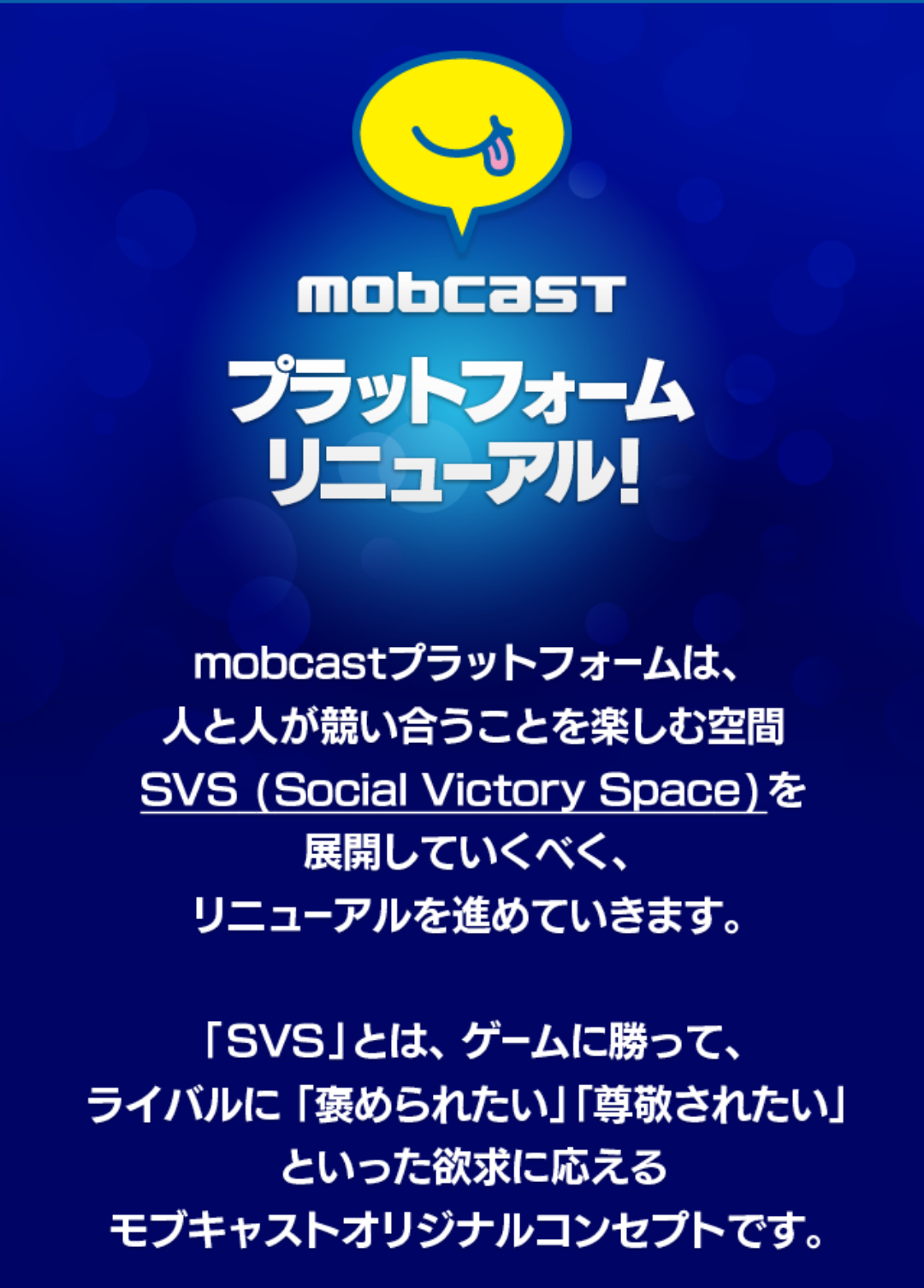 モバイルゲームプラットフォーム「mobcast」(http://mobcast.jp/)の運営を行う株式会社モブキャスト(本社:東京都港区、代表取締役:藪考樹)は、この度、主力事業であるスポーツに特化したプラットフォームサービスを刷新し、「30代を中心とした負けず嫌いな男性」をメインターゲットに、独自概念「SVS(Social Victory Space)」に沿ったコミュニケーションサービスを展開する為、大幅なリニューアルをおこなうことを発表いたします。