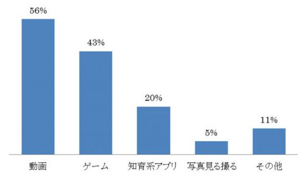 「子どもがどのように利用しているか」を聞く設問で最も多かった回答が、「Youtube等の動画視聴」。お気に入りのキャラクターの動画を繰り返し見ている、という声が多くあがっています。次に「ゲーム」が続き、LINEゲーム(※1)やパズル&ドラゴンズ(※2)、その他のパズルゲームなどを多くの子どもが楽しんでいます。