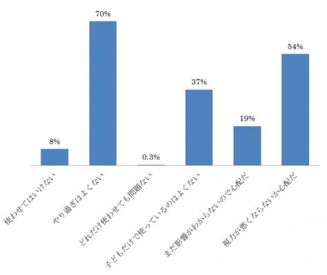 使用時間を聞く設問では、「数分」45%、「10~30分」39%となり、多くの場合、親たちが節度をもって使用させていることが伺えますが、「1時間ほど連続で使用することはありますか」という問いにおいては、「よくある」7%、「ときどきある」20%となり、連続使用時間が長くなることもしばしばあるようです。