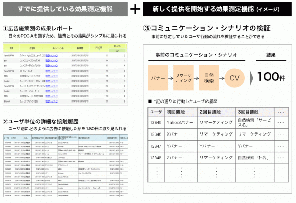 ビービットは、同社が提供する広告効果測定ツール「ウェブアンテナ」で、広告施策別の成果レポートや、ユーザ単位の接触履歴を表示する機能を実装していましたが、これらに加えて、コミュニケーション・シナリオを検証できる機能を提供いたします。