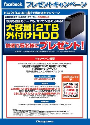 今回のキャンペーンでは、ドスパラ公式facebookページに「いいね!」を押し、かつキャンペーン応募ページよりご応募いただいた方の中から抽選で、写真も動画もデータも、ガンガン詰め込める!大容量!2TB外付けHDD(ハードディスクドライブ)を5名様にプレゼントいたします。