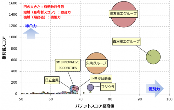 本調査の総合力上位3社について、総合力の経時変化(各年末時点の権利者スコア推移)を示します。現在トップの住友電工グループは2010年末から飛躍的に総合力を伸ばしていることが分かります。また、2012年末から最新年にかけては古河電工グループが最も総合力を伸ばしています。