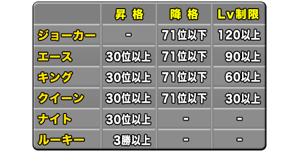 ※ジョーカー、エース、キング、クイーンのリーグで戦闘回数が1回もなかった場合、必ず1リーグ降格します。