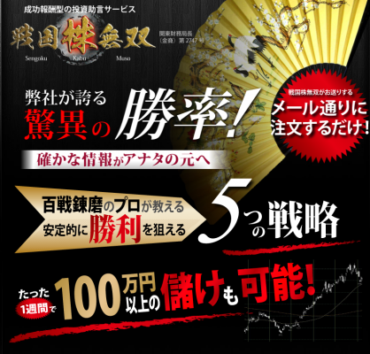 株式銘柄情報を成功報酬で受け取れる「戦国株無双」は、推奨銘柄が目標利益に到達しない限り料金が発生しない投資助言サービスです。