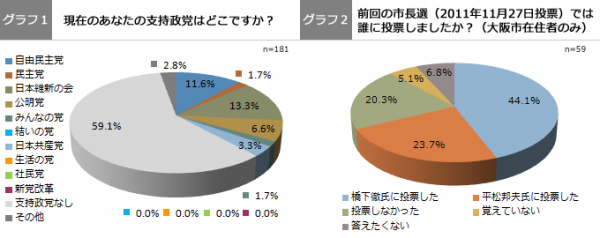 政治・選挙プラットフォーム「政治山」を運営する株式会社パイプドビッツ(本社 東京都港区、代表取締役社長CEO 佐谷宣昭、証券コード3831、以下「パイプドビッツ」)は、2014年3月10日から14日にかけて、株式会社うるる(本社 東京都中央区、代表取締役 星知也)が提供する、主婦特化型マーケティング調査サイト「暮らしの根っこ」の大阪府在住・既婚者の会員に、3月23日の大阪市長選挙に関する意識調査を実施し181名から回答を得ました。3月19日に「政治山」にて調査レポートを発表しましたので、お知らせいたします。