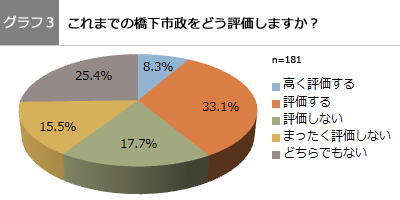 橋下市政に対する評価は、「高く評価する」8.3%と「評価する」33.1%をあわせた支持派が41.4%、「評価しない」17.7%と「まったく評価しない」15.5%をあわせた不支持派が33.2%と賛否拮抗の結果になりました。自由記述で寄せられた意見からは、橋下氏個人に対する評価が橋下市政への評価に繋がっていることが伺えました。