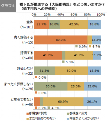 橋下氏が推進する「大阪都構想」への賛否は、賛成22.7%、反対16.0%、まだ判断がつかない42.5%、内容がわからない18.8%になりました。橋下市政への評価別にみると、支持派では大阪都構想に賛成が多く、不支持派では大阪都構想への賛成は0%でした。なお、橋下市政への評価にかかわらず、内容がわからないと回答した層がまんべんなく存在することがわかりました。