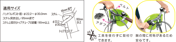 サイクルポケットは、一般車・小径車・スポーツ系車種など、オールマイティーに対応可能です。工具を一切使わず、ベルトをハンドルに引っ掛けて、スペーサーをステムにはめ込むだけで簡単に取り付けできます。また、サイクルポケットはハンドルの内側に取り付けるため、腕で荷物をガードでき、安心して荷物を入れられます。スポーツ系車種対応の布製の商品は以前から販売されていますが、他にはない樹脂製で、かわいいカラーが選べるのも特徴です。