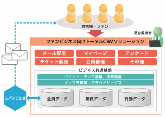 スパイラル(R)APIを使って「ファンビジネス向けトータルCRMソリューション」と「スパイラル(R)」をシステム連携することで、会員データを同期した上でファンの方々にメールマガジンなどをお送りし、ファン育成を推進しています。