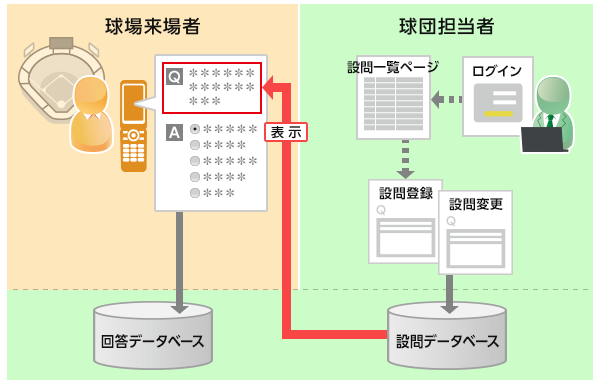 また、球団ご担当者様が、「スパイラル(R)」のマイエリア機能で構築された質問登録用Webフォームにログインしてクイズを質問データベースに登録すると、球場では、質問データベース内の情報を参照するようPHPで制作した出題画面が大型ビジョンに映し出され、それを見た観戦者がクイズを楽しむクイズキャンペーンイベントも実施されています。