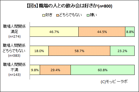 図表参照:【図5】職場の人との飲み会好きか(n=800/職場の人間関係満足別集計)