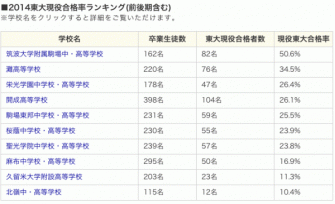 「数」で1位の開成は、現役合格者数を卒業生数で割ると26.1%。その順位は4位に下がります。逆に1位に躍り出るのは、「数」で3位の筑波大学附属駒場。卒業生数162名に対し、現役合格者数は79名、48.8%という驚きの現役合格率を誇ります。