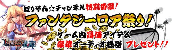 『ほりぞん☆チャンネル』で活動している出演者達がお得意のマイペースで人気アプリへと躍進中のホリゾンリンク新作アプリ『ファンタジーロア』を『ほりぞん☆チャンネル』の特番として2014年3月28日(金)22時よりご紹介いたします。視聴者プレゼントには、豪華なゲーム内アイテムと豪華なオーディオ機器をご用意しております。