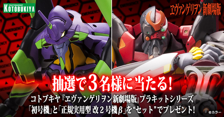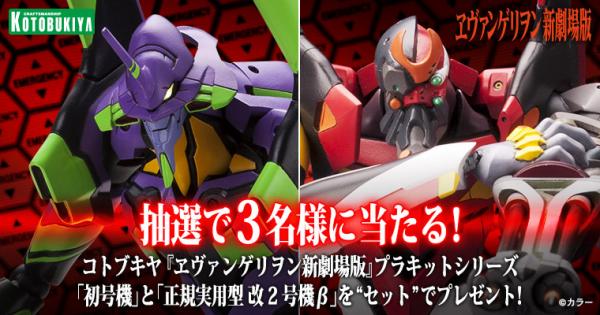 ホビーメーカーコトブキヤ(代表:清水一行 本社:東京都立川市曙町)は、3月29日(土)、Facebookユーザー向けに、同社から発売中の『ヱヴァンゲリヲン新劇場版』プラキットシリーズが当たるプレゼントキャンペーンを開始しました。『ヱヴァンゲリヲン新劇場版:破』の「エヴァンゲリオン初号機」そして「エヴァンゲリオン 正規実用型 改2号機β」は初の1/400スケールでの商品化であり、CADシステムの精密な関節設計と原型師による造形美が融合した、”全く新しいエヴァンゲリオン”といえる一品となっています。こちらの商品をセットにして、アンケートにお答え頂いた方から抽選で3名様にプレゼントいたします。本キャンペーンはFacebook登録ユーザー限定となっており、応募にはFacebookへの登録が必須となります。キャンペーンは4月27日(日)いっぱいまで。