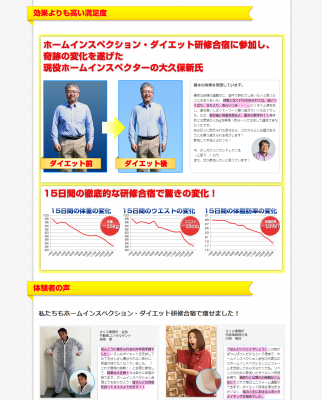 ほんとうに痩せられるのか半信半疑でした。いろんなダイエット法を試してみてもぜんぜん痩せられない自分に、自信が持てなくなっていました。 「これが最後の挑戦!」と合宿に参加して、結果は大正解!今は自分に自信が持てます。ホームインスペクション合宿どうもありがとう!皆さんにも自信を持ってオススメできます!!
