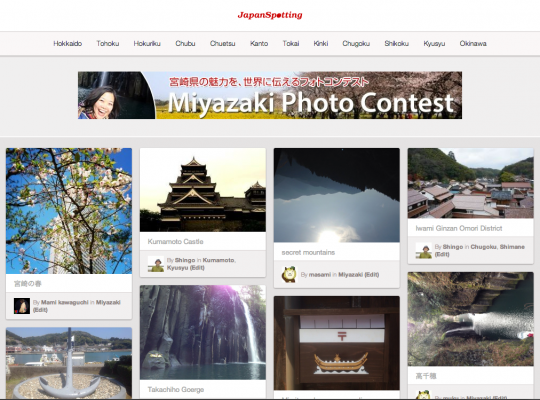 “JapanSpotting”は、サービス公開を記念して、「宮崎県の魅力を世界に伝えるフォトコンテスト」< http://japanspotting.jp/photo-contest/miyazaki >を開催します。ユーザーが投稿者した写真を、“JapanSpotting”がソーシャルメディア等を活用して、世界中に情報発信する事で、観光誘致のきっかけづくりを行います。期間は、4月下旬まで。審査員により優秀な投稿と選ばれた写真には、地元の特産品の贈呈を行います。