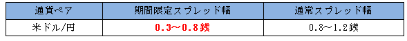 内 容:「米ドル/円」のスプレッドを『0.3銭~0.8銭』に縮小(※)