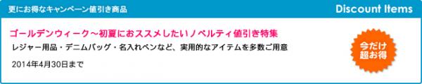 販促ノベルティ卸売りセンターでは、通常の卸売価格よりも更にお得な!値引きキャンペーンを期間限定で開催します。是非、お得なこの機会に名入れノベルティをご検討ください。お得な値引き期間は、2014年4月30日まで。