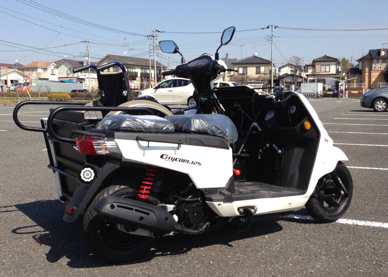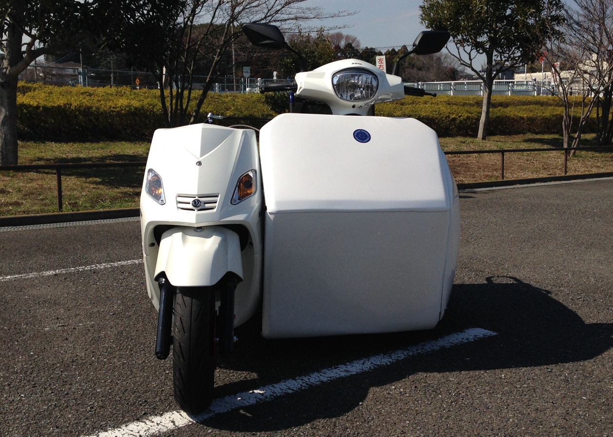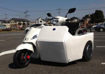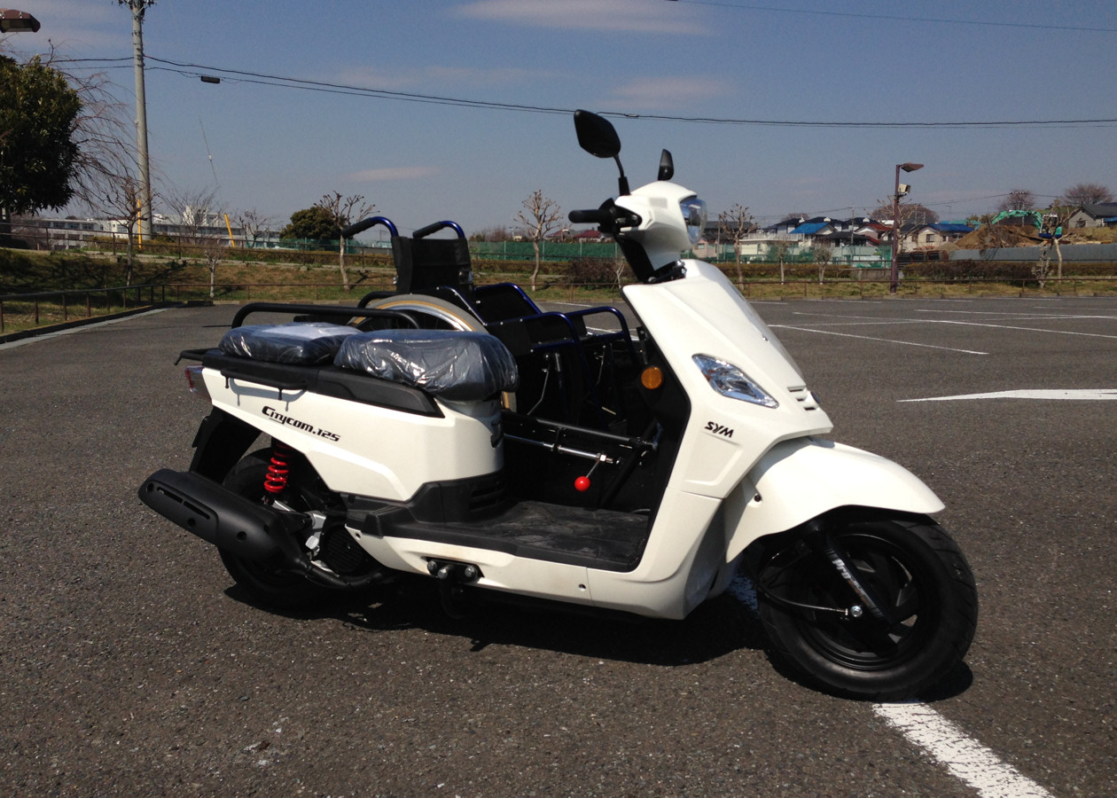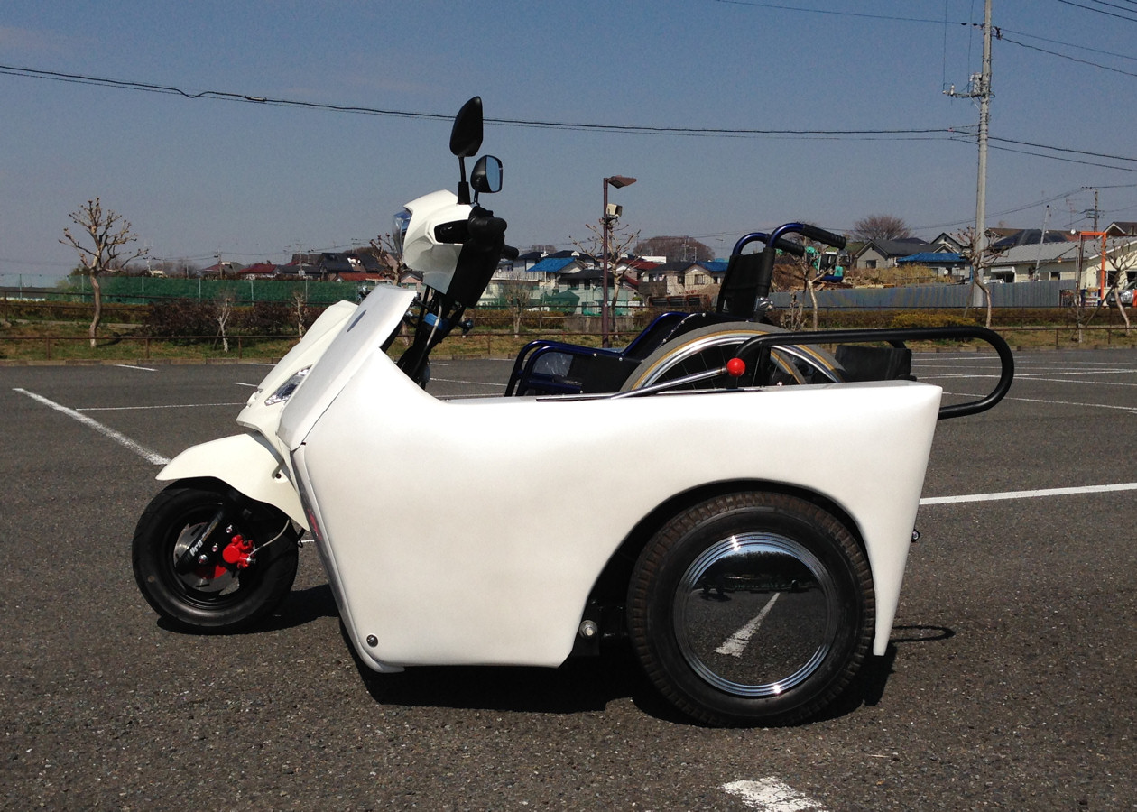今回第二弾として車椅子を常用する人達に風を切って走る楽しみを味わってもらいたいと、車椅子のまま運転可能な車両を開発しました。この車両の特徴は125ccのスクーターをベースに車椅子に乗ったまま昇降装置を操作すると共に、そのまま運転を行うことが可能なところです。また、この車両を福祉車両とするため厚労省に島津さん自ら何度も掛け合い、前例の無い中で無事に福祉車両として要件を満たしていることを確認頂くことができ、消費税非課税対象商品になっています。