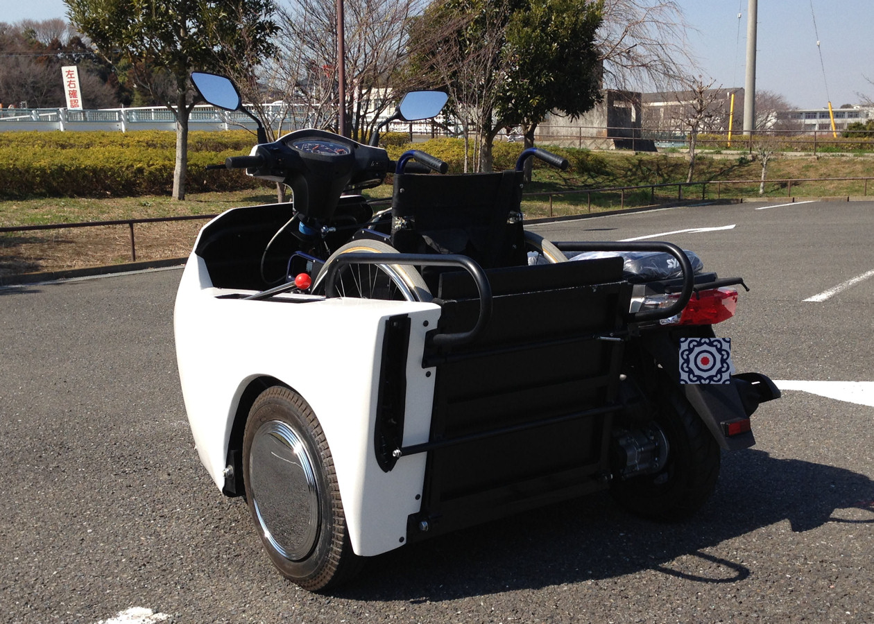 両下肢に障害を持つ社員(島津さん)と片山社長の長年の夢を実現するため、車椅子に乗ったまま乗車可能な三輪バイクを製作するプロジェクトを平成25年9月より始動しました。障害者の観点から物を見ることができる島津さんをプロジェクトリーダーとし、第一弾として足腰に障害を持つ家族や友人と共に風を切って走る楽しみを味わってもらいたい。そんな願いをかなえるための車椅子介助用車両の開発。