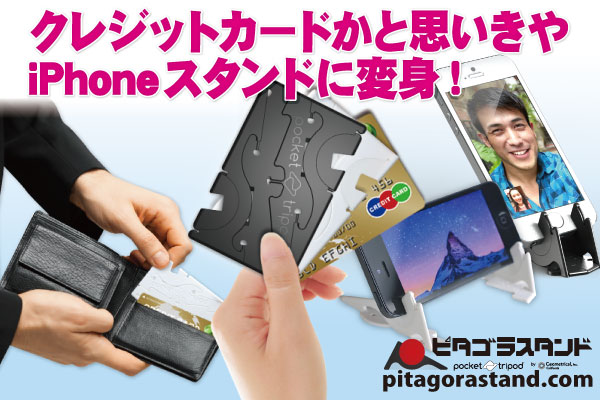 【ピタゴラスタンド】(http://www.pitagorastand.com/)は、折りたたんでしまえば、クレジットカードと同じサイズ。