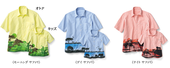 動物好きのゴリさんがずっと行ってみたいと思っているケニアのマサイマラ国立公園で1日を過ごしたいという思いからアイデアをどんどん広げ、朝・昼・晩に繰り広げられる光景をおしゃれに表現したシャツです。アロハシャツや沖縄のかりゆしウェアは上部の柄が多いですが、このシャツは、おなかの部分にプリントすることで、大草原をひとり占めした気分になれます。3種類あるそれぞれのデザインには、サファリの風景はもちろん、動物の生態にもこだわって大地に包まれるイメージに仕上げました。こどもたちもよく知っている動物たちを登場させ、3枚でジャングルの1日の時の流れと物語が展開されています。