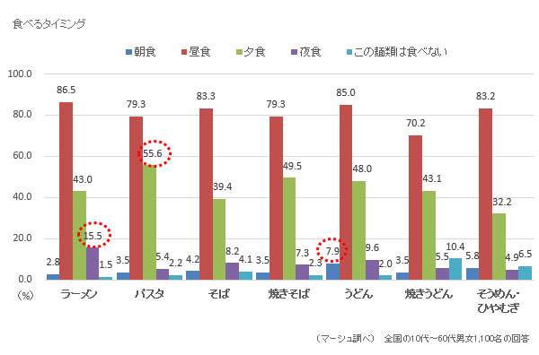 麺類は全般的に「夕食」よりも「昼食」として食べるものというイメージが強いことがわかる