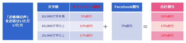 1998年創業、SEM(検索エンジンマーケティング)を軸としたグローバルマーケティングを展開するアウンコンサルティングは、海外へのマーケティング支援を見据えて2009年4月に翻訳事業を開始いたしました。この度、翻訳事業開始から5周年を迎えたことから、日頃のご愛顧と感謝を込めて、アウンランゲージに対するご意見・ご感想をお寄せいただいた方には、翻訳・校正サービスを通常料金から最大15%割引※1する「お客様の声」割引キャンペーンを実施することとなりました。本キャンペーンはFacebook割※2との併用が可能ですので、最大20%の割引価格でご利用いただけます。 この機会に、ぜひ皆様のご意見をお聞かせください。