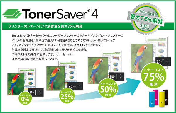TonerSaver 4 (トナーセーバー 4)は、レーザープリンターやインクジェットプリンターのトナー/インクの消費量を1%刻みで最大75%まで削減することのできる、Windows用ソフトウェアです。アプリケーションから印刷コマンドを実行後、スライドバーで希望の削減率を設定するだけで、高品質な仕上がりを維持しながら、印刷コストを効果的に削減します。文字や図形はもちろんのこと、バーコードやQRコードの読み取りにも支障のない、高品位な印刷出力を維持しつつ、トナー/インクの消費量を効果的に削減します。また、印刷ジョブごとに詳細なログを記録することができるので、コスト管理や情報漏洩抑止に役立てることもできます。トナーセーバーは世界6か国で特許を取得しています。