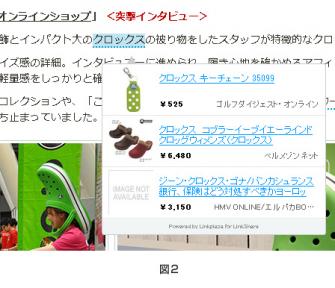 「Linkplaza」は、Studio Ousiaが開発した高精度な人工知能エンジンにより、ブログなどのウェブサイトに掲載されたテキストから購買頻度が高いと推測されるキーワードを自動で判別、抽出してアフィリエイトリンクに変換する(図1)ツールです。同リンクをクリックすると、アフィリエイトリンクの埋め込まれた商品情報が表示(図2)されます。