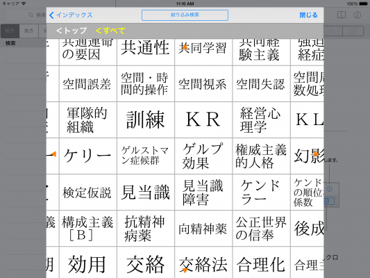 LogoVista電子辞典で培った検索方法を継承。前方一致/後方一致/完全一致/全文検索といった豊富な検索オプションを利用できます。また文字を入力すると候補見出し語が表示され、うろ覚えでも検索できるインクリメンタルサーチや、検索結果に表示された本文中の用語をなぞることでそのまま連続辞書引きも可能。思考を妨げることなく次々と検索できるのが特長です。マルチタッチによる拡大やセンサーによる画面の回転にも対応しています。