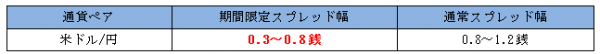 内 容:「米ドル/円」のスプレッドを『0.3銭~0.8銭』に縮小(※)