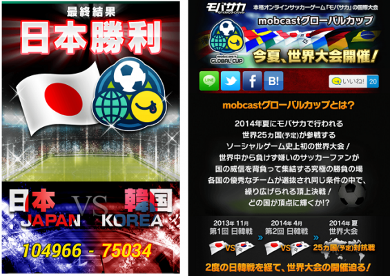 日本と韓国それぞれの国のmobcastプラットフォーム上でモバサカをプレイしているユーザーの中から、代表となる精鋭を選出し、両国で戦い合うソーシャルゲーム初の日韓戦です。