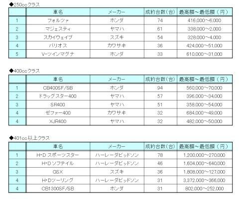 オークネット バイクオークション 3月成約排気量別ランキング