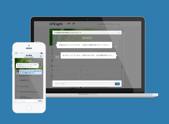 今回の機能強化では、スマートフォンアプリにのみ対応していたメッセージ機能、ニュース通知機能をPC版Eightにも実装します。「転職・異動情報の通知をきっかけに、メッセージ機能を使って連絡する」という利用方法をはじめ、名刺を基点とした新たなコミュニケーションスタイルを提案します。
