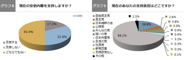 安倍政権の支持率は17.2%で、不支持派32.8%が支持派を上回る結果になりました。報道各社の調査ではおおむね50%台で推移している内閣支持率と比較すると著しく低い支持率であり、自民党が最多支持政党であるものの、既婚女性は安倍政権に厳しいことがわかりました。