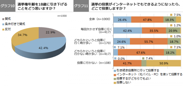 選挙権年齢を18歳に引き下げることへの賛否は、「賛成」22.9%と「条件付き賛成」42.4%をあわせた賛成派が65.3%にのぼり、反対派34.7%を大きく上回りました。