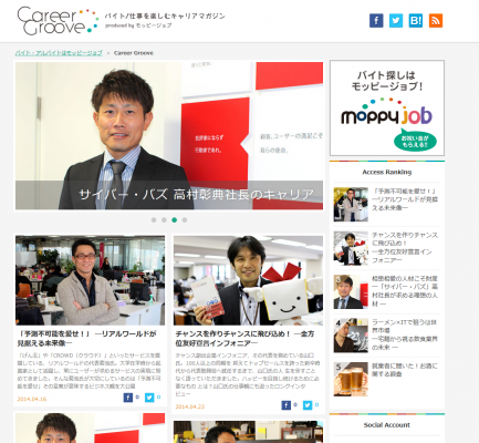 セレスでは、採用が決まるとお祝い金が貰えるアルバイト求人情報サイト「モッピージョブ」を運営しています。「Career Groove(キャリアグルーヴ)」はモッピージョブでアルバイトを探すユーザー向けに、仕事の達人たちに自分のキャリアをいかに楽しんでいるかをインタビュー形式で紹介するキャリア系ウェブマガジンです。起業家や有名人にインタビューを行い、過去のバイト生活や就職活動時の思い、転職活動についてや起業にいたったエピソードなどのインタビューをおこなってまいります。また、従来からモッピーラボ連動コンテンツとして仕事に関するアンケート調査結果のウェブマガジンである「みんなの声」を「Career Groove(キャリアグルーヴ)」に統合して、インタビュー記事とアンケート調査記事を提供してまいります。