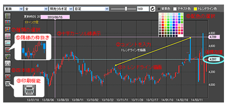 トレンドライン描画/コメント入力/十字カーソル線表示/現在値線表示/陽線の枠抜き表示/配色の選択/チャートの種類選択/四本値一覧の表示・印刷機能