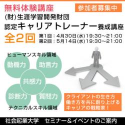 本講座では、(財)生涯学習開発財団認定「キャリアトレーナー(認定キャリアトレーナー)」資格の取得が可能です。本認定資格は、キャリア支援に携わる際に、長期的なキャリア戦略の考え方やスキルを学んだことを証明することを目的として(財)生涯学習開発財団の認可を受けて制定された資格制度です。