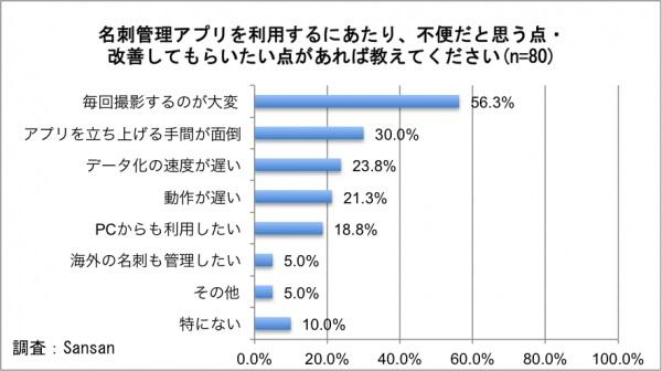 他に挙がった「データ化の速度が遅い(23.8%)」「動作が遅い(21.3%)」「PCからも利用したい(18.8%)」という不便さは、利用しているアプリによって差があると思われますが、最も意見の多かった「毎回撮影するのが大変(56.3%)」については、どの名刺管理アプリにも共通して言える課題だと考えられます。