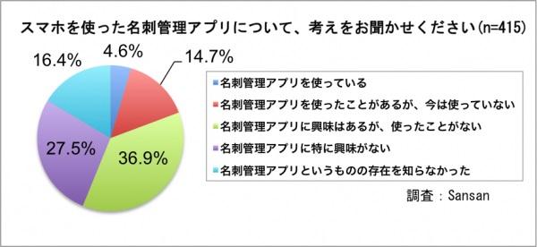 一方で名刺管理アプリについて「使っている」「使った事がある」「興味がある」というビジネスマンは56.2%と大半を占めており、名刺管理アプリは一般的に認知されてきていると考えられます。