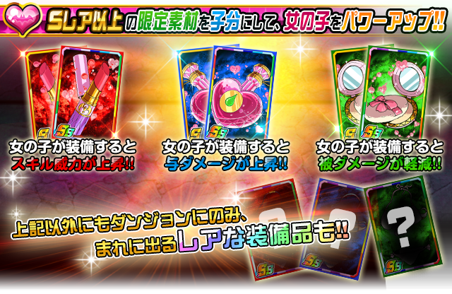 本ダンジョンではモンスターの他に「おしゃれアイテム」が出現します。「おしゃれアイテム」はカード化するか、イベント限定ガチャで「小悪魔P」を消費することで入手でき、強化素材として使うことができます。また、「小悪魔リノ(妹)」と、リノのお姉ちゃん「小悪魔ナナ(姉)」には、強化値2倍の効果があります。さらに、上記以外にもダンジョンでのみ稀に出現するレアな装備品も登場します。イベント期間中は、手に入れた限定SSを一気に強くする大チャンス!!